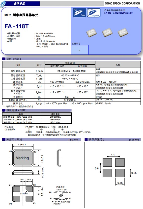 超小型1612mm貼片晶振FA-118T是目前愛普生石英晶體諧振器MHz級別外部尺寸最小的一款無源晶振,因此晶振本體上沒有印字,而是空白的,頻率范圍:24MHz至54MHz,四腳貼片晶振,工作溫度范圍-40℃至+85℃,F(xiàn)A-118T晶振體積小,焊接可采用自動貼片系統(tǒng),產(chǎn)品本身小型,表面貼片晶振,特別適用于有小型化要求的電子數(shù)碼產(chǎn)品市場領(lǐng)域。因產(chǎn)品小型,薄型優(yōu)勢,耐環(huán)境特性,包括耐高溫,耐沖擊性等,在移動電話,移動通信領(lǐng)域得到了廣泛的應(yīng)用,晶振產(chǎn)品本身可發(fā)揮優(yōu)良的電氣特性,滿足無鉛焊接的高溫回流溫度曲線要求。