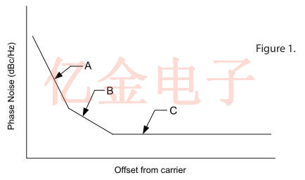 在所需信號的各種偏移處的響應圖通常由對應于振蕩器中的三個主要噪聲產(chǎn)生機制的三個不同斜率組成,如圖1所示.相對靠近載波(區(qū)域A)的噪聲稱為閃爍FM噪聲;其大小主要取決于晶振晶體的質量.最佳近距離噪聲結果是在4-6MHz范圍內使用5次泛音AT切割晶體或第3次泛音SC切割晶體獲得的.雖然平均效果不是很好,但使用10MHz區(qū)域中的3個泛音晶體也可以獲得出色的近距離噪聲性能,尤其是雙旋轉型,較高頻率的晶體由于其較低的Q值和較寬的帶寬而導致較高的近距噪聲.