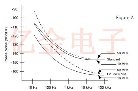 圖1中B區(qū)的噪聲稱為“1/F”噪聲,是由半導體活動引起的.采用低噪聲“L2”晶體振蕩器的設計技術將其限制在非常低的,通常無關緊要的值.圖1的區(qū)域C稱為白噪聲或寬帶噪聲.“L2”晶體振蕩器中的特殊低噪聲電路相對于標準設計提供了顯著的改進(15-20dB).當采用倍頻從較低頻率的晶體獲得所需的輸出頻率時,輸出信號的相位噪聲增加20log(倍增因子).這導致整個電路板上的噪聲降低大約為6dB,用于倍頻,10dB用于頻率三倍,20dB用于十倍乘法.