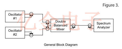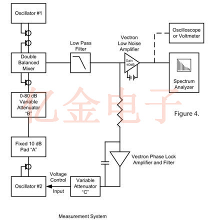 圖3示出了由NIST建議并由Vectron晶振用于測量l(f)的方法的框圖.來自兩個相同標稱頻率的振蕩器的信號被施加到混頻器輸入.除非振蕩器具有出色的穩(wěn)定性,否則一個振蕩器必須具有用于鎖相的電子調諧.非常窄的頻帶鎖相環(huán)(PLL)用于在這兩個源之間保持90度的相位差.混頻器操作使得當輸入信號異相90度(正交)時,混頻器的輸出是與兩個振蕩器之間的相位差成比例的小波動電壓.通過在頻譜分析儀上檢查該誤差信號的頻譜,可以測量這對振蕩器的相位噪聲性能.如果一個振蕩器的噪聲占主導地位,則直接測量其相位噪聲.當兩個測試振蕩器電氣相似時,有用且實用的近似是每個振蕩器貢獻測量噪聲功率的一半.當三個或更多個振蕩器可用于測試時,可以通過求解表示從振蕩器對的置換測量的數(shù)據(jù)的聯(lián)立方程來精確地計算每個振蕩器的相位噪聲.