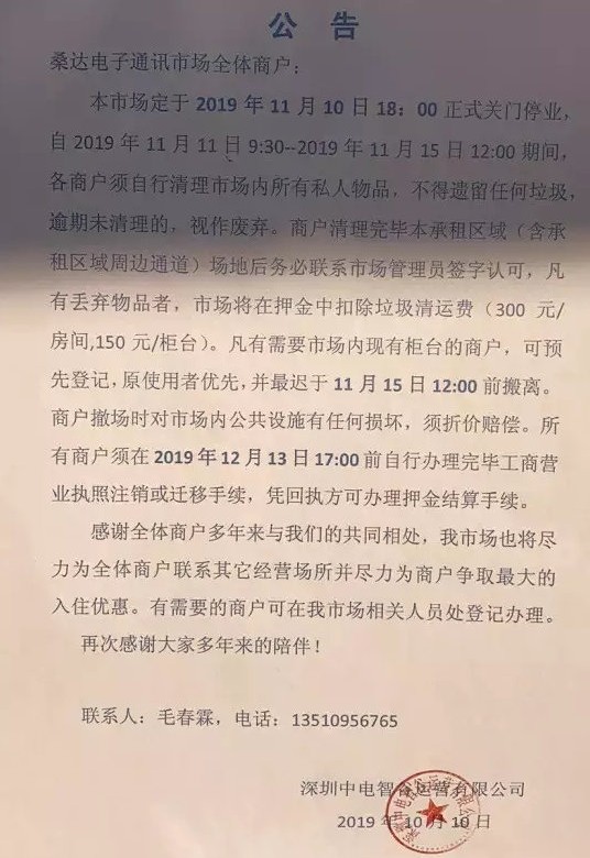 如今,桑達(dá)電子通訊市場即將停業(yè),桑達(dá)電子通訊市場各個出入口均貼了《公告》,宣布將在11月10日正式停業(yè).該《公告》始發(fā)時間是2019年10月10日,一個月后,桑達(dá)電子通訊市場將正式停業(yè)清場.