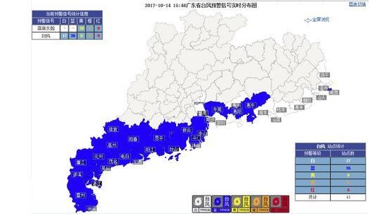 截至15:46時,廣東全省共有26個市縣發(fā)布臺風(fēng)藍(lán)色預(yù)警信號.
