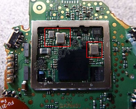 它是主系統(tǒng)CPU,即飛思卡爾(現(xiàn)恩智浦)MK28FN2M0ACAU15 Kinetis K28基于Arm Cortex-M4的應(yīng)用處理器.然而,法拉第籠一角有個(gè)大IC,其身份是個(gè)謎.另一款Garmin手表(型號:A03405)有塊類似IC,FCC有照片聲稱它是Wi-Fi收發(fā)器,但由于我們已經(jīng)在PCB的另一側(cè)識(shí)別了該芯片,因此我們知道在這個(gè)特定設(shè)計(jì)中并非如此.