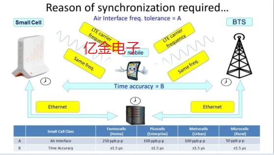 小型蜂窩基站是一種小量用戶端通信基站,其主要作用就是為網(wǎng)絡(luò)通信社區(qū)減輕一定的負(fù)荷,在圖一和圖二中就能夠清楚明了的看出來;其中圖一展示了小型基站用于補(bǔ)充現(xiàn)有基站無法覆蓋的死區(qū)(實(shí)施前紅色區(qū)域)的通信質(zhì)量(橙色區(qū)域),圖二則是表示小型基站可以覆蓋現(xiàn)有基站所覆蓋的流量溢出區(qū)域. 小型基站,從其名字就能夠看得出來,這種基站小巧且易于安裝,與現(xiàn)代化基站相比,它的運(yùn)行成本低時(shí)最大的優(yōu)點(diǎn),但是為了適應(yīng)未來業(yè)務(wù)量的增長(zhǎng),為了有效利用有限的頻譜,LTE通信方案由FDD逐步演化為TDD,但在這種情況下,所需的精度時(shí)鐘就會(huì)非常高.所以如果采用TDD方案,為提高終端的接收質(zhì)量,那么基站和小基站之間要求精確的”頻率同步”,和”時(shí)間同步”,如圖3所示