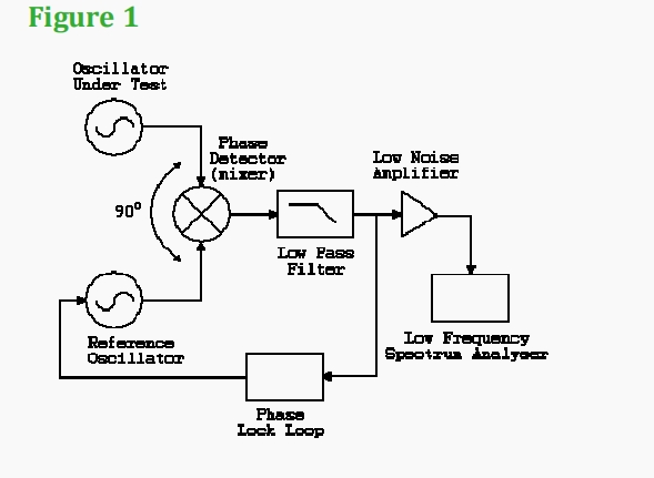 下一個(gè)考慮因素是用于進(jìn)行測(cè)量的測(cè)試設(shè)備。相位噪聲的測(cè)量是通過將被測(cè)振蕩器正交鎖定到參考振蕩器來實(shí)現(xiàn)的,如圖1所示。正交鎖定的效果是去除載波頻率,只留下非相位相關(guān)的噪聲分量。低通濾波器不是用來過濾相位噪聲的,而是用來去除2x頻率分量的。相位檢測(cè)器(混頻器)產(chǎn)生兩個(gè)輸入頻率的和(2x)和差(我們只對(duì)差感興趣,即沒有載波頻率的部分)。低噪聲放大器可以根據(jù)低頻頻譜分析儀的分辨率進(jìn)行切換。