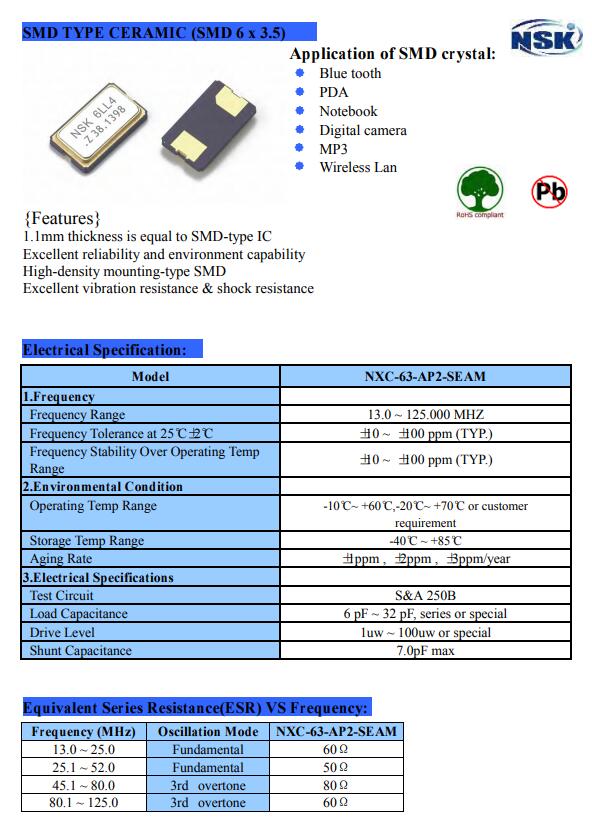 臺(tái)灣津綻晶振,NXC-63-AP2-SEAM晶振,6035二腳晶振臺(tái)灣津綻大陸代理,6035封裝,超小型表面貼片型SMD晶振型號(hào),最適合使用在汽車電子領(lǐng)域中,也是特別要求高可靠性的引擎控制用CPU的時(shí)鐘部分.低頻晶振可從7.98MHz起對(duì)應(yīng),小型,超薄型具備強(qiáng)防焊裂性,NSK英晶體在極端嚴(yán)酷的環(huán)境條件下也能發(fā)揮穩(wěn)定的起振特性,產(chǎn)品本身具有耐熱,耐振,耐撞擊等優(yōu)良的耐環(huán)境特性,滿足無(wú)鉛焊接以及高溫回流溫度曲線要求,符合AEC-Q200標(biāo)準(zhǔn).